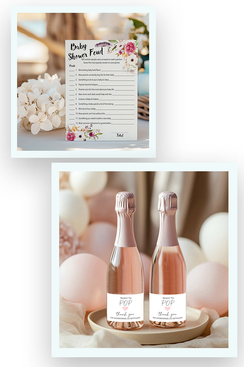 We specialize in elegant wine labels, mini champagne labels, invitations, and party games designed to celebrate life’s most meaningful moments—bridal showers, weddings, pregnancy announcements, baby showers, graduations, and milestone birthdays.