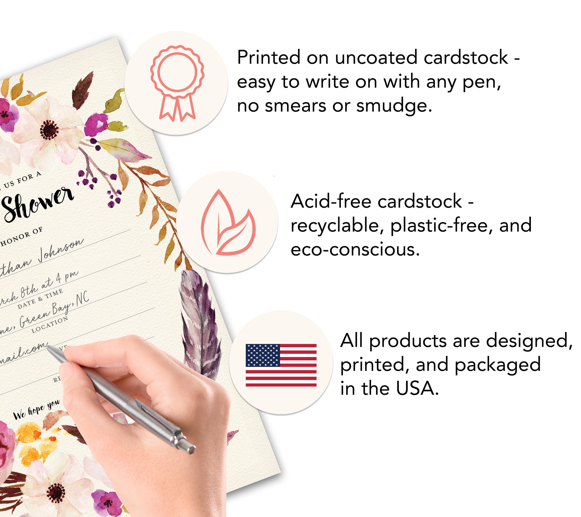 - DESIGN: A bohemian-inspired theme featuring rustic watercolor pink florals and a delicate feather, paired with a modern brush-style font.