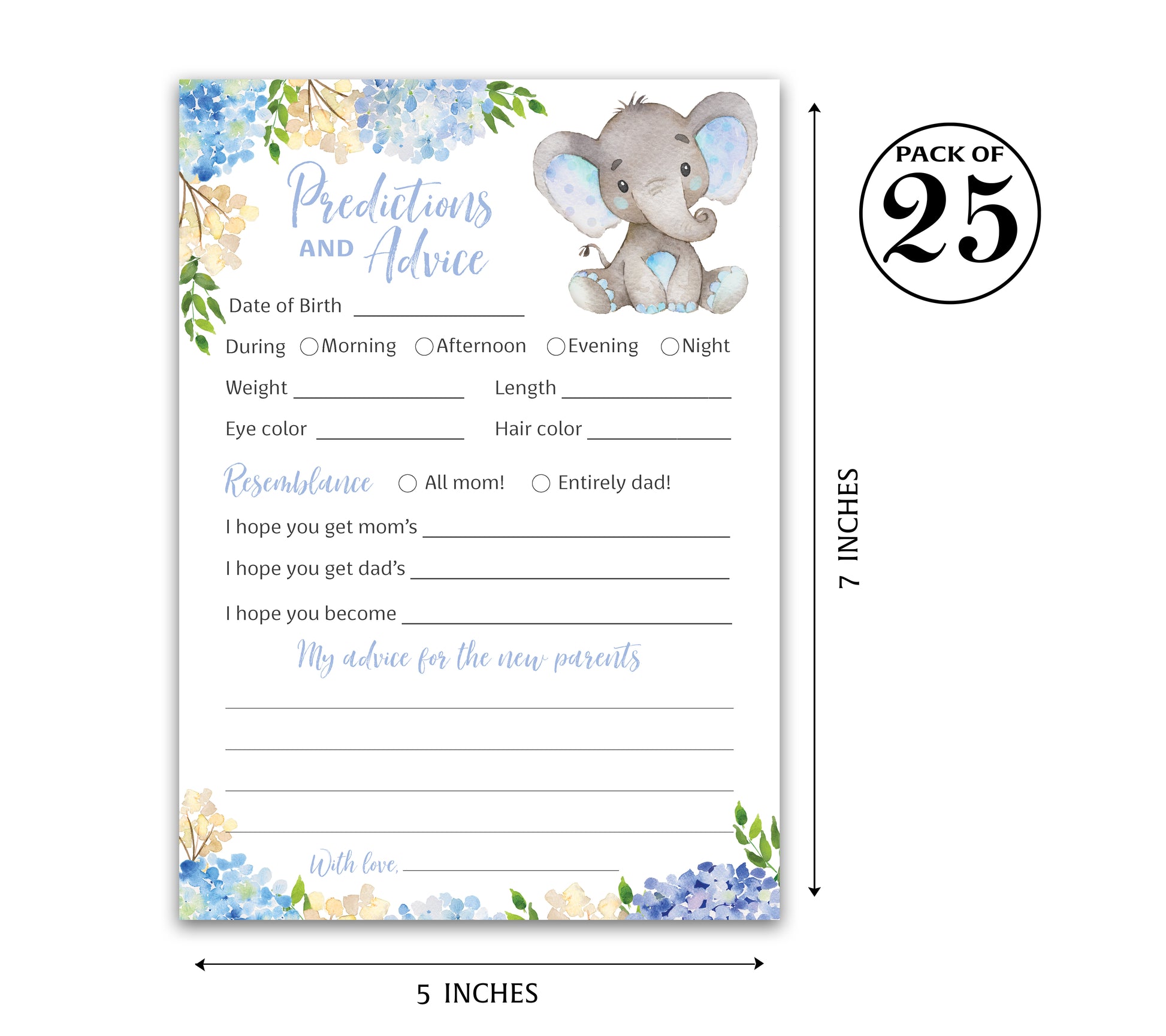 Blue Elephant Floral Boy Baby Shower Game - Predictions & Advice Cards • SET of 25