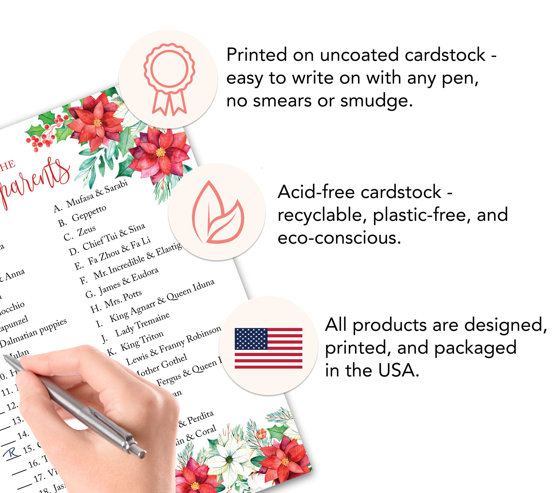 - PREMIUM THICK SMOOTH CARDSTOCK (14-pt): These sturdy game cards are easy for guests to hold and write on comfortably.