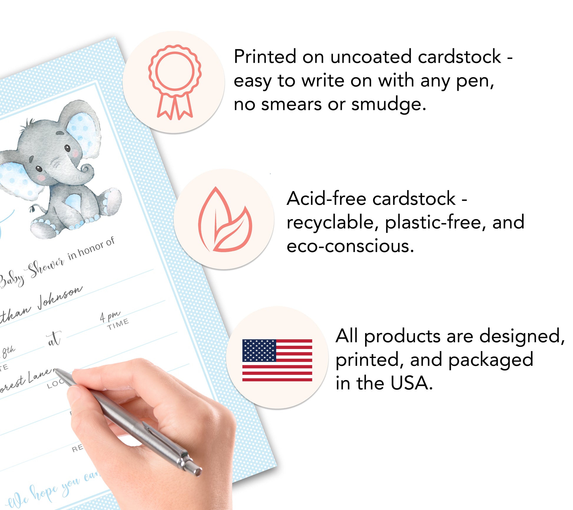 - DESIGN: Features a cute watercolor elephant framed by a blue polka dot border, paired with a playful, whimsical charcoal gray font in a minimalist style. Perfect for a minimalist jungle or little peanut-themed event.