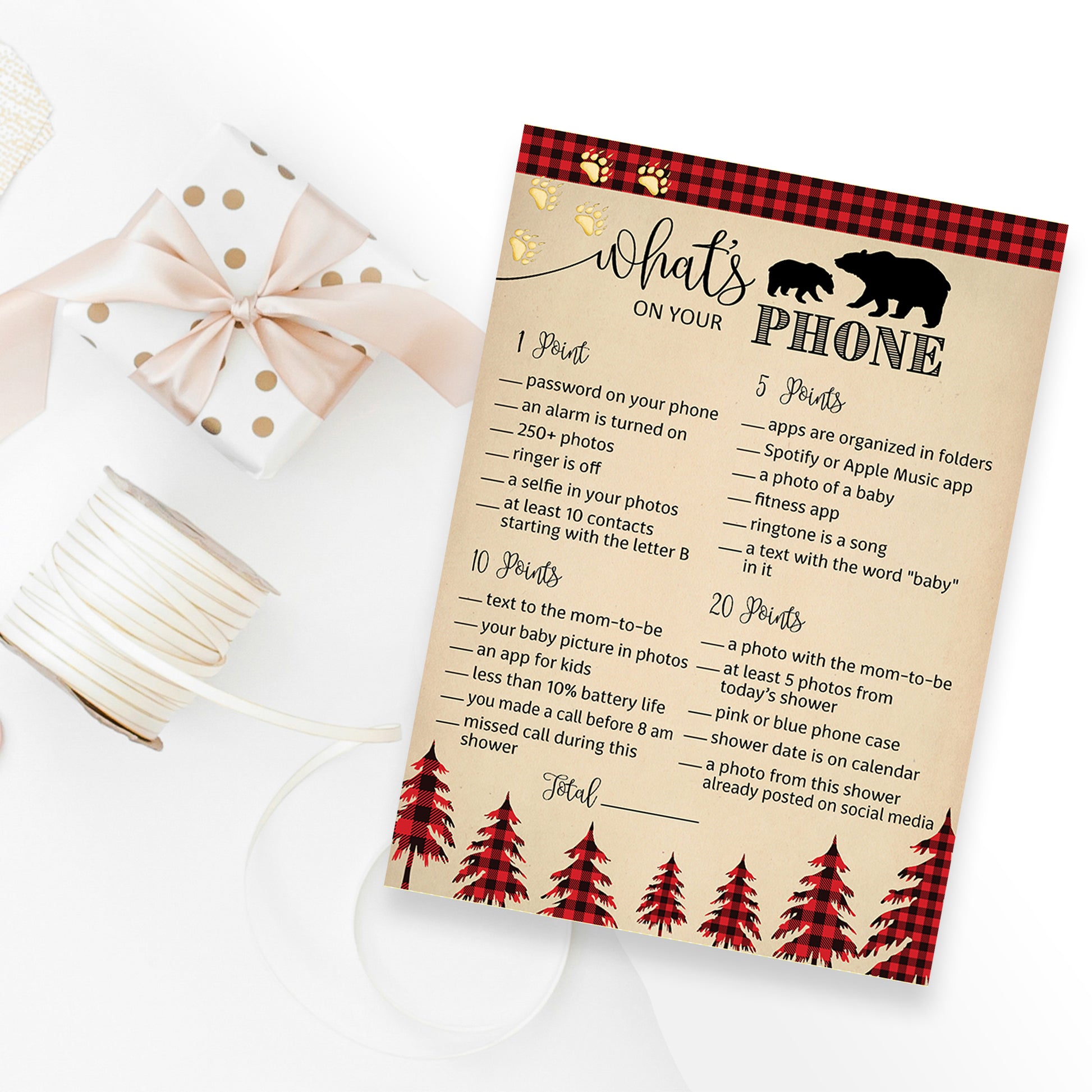 Lumberjack What’s On Your Phone • 25 Cards • Buffalo Plaid Baby Shower
