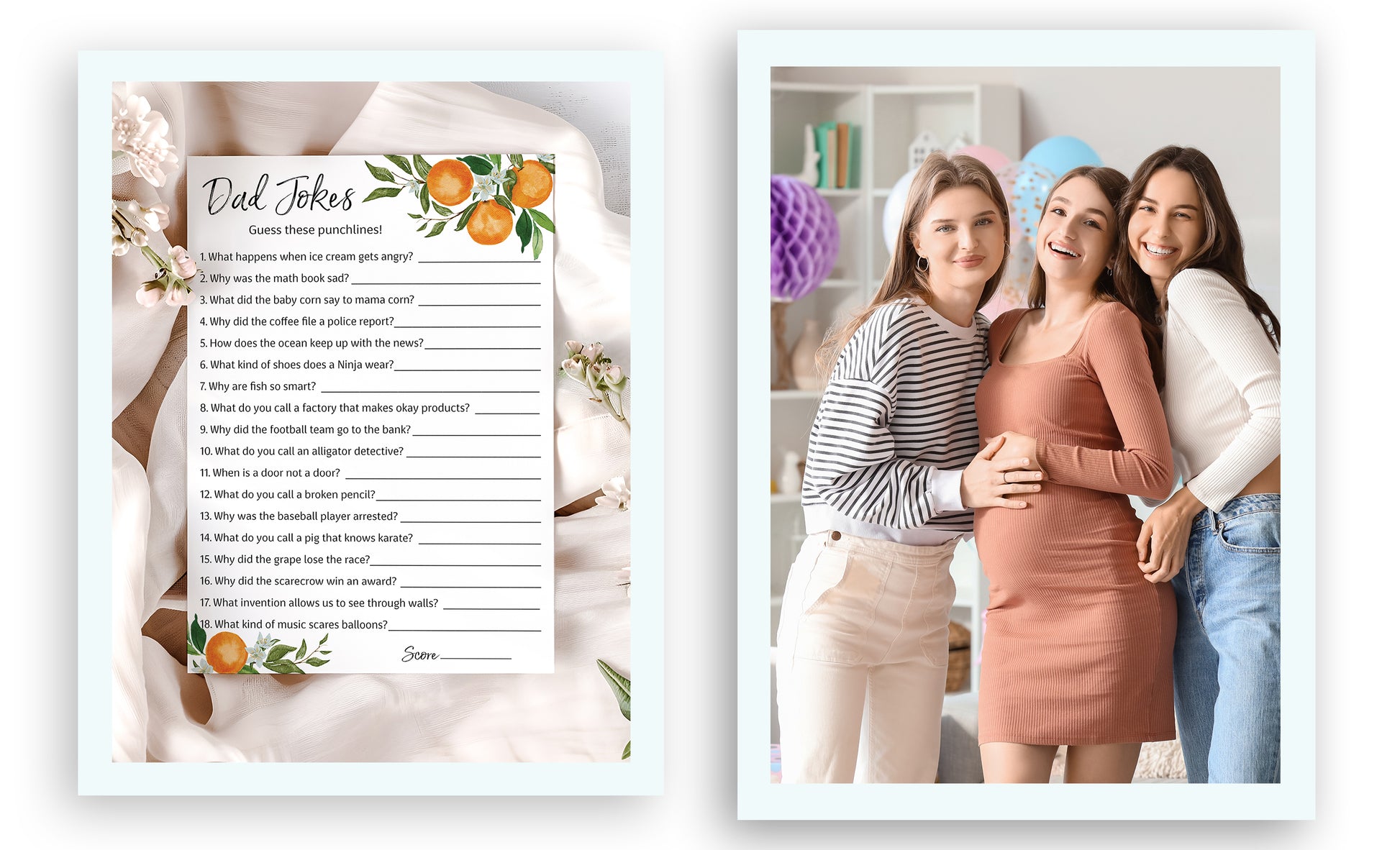 - SET OF 25 DAD JOKES GAME CARDS: Bring laughter to your baby shower with this fun game filled with classic dad jokes — perfect for adding lighthearted moments to the celebration!Perfect for Baby Showers, Couples Shower, Gender Reveal parties, and Baby birthday.