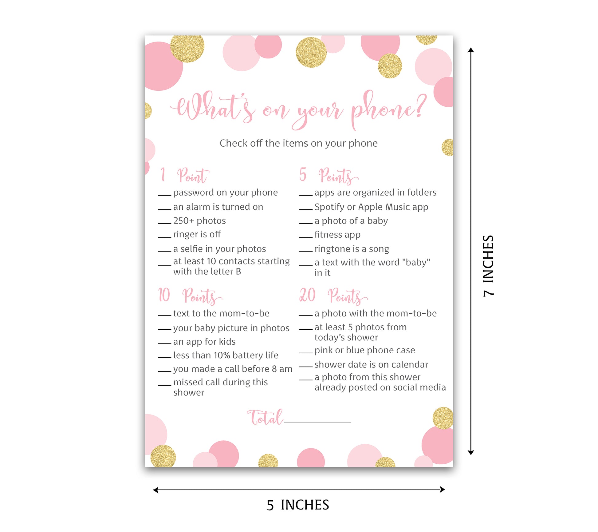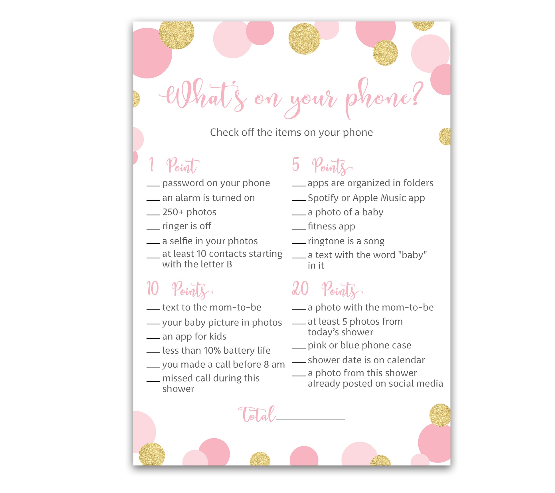 Pink & Gold Polka Dot Confetti Girl Baby Shower Game - What's On Your Phone • SET of 25