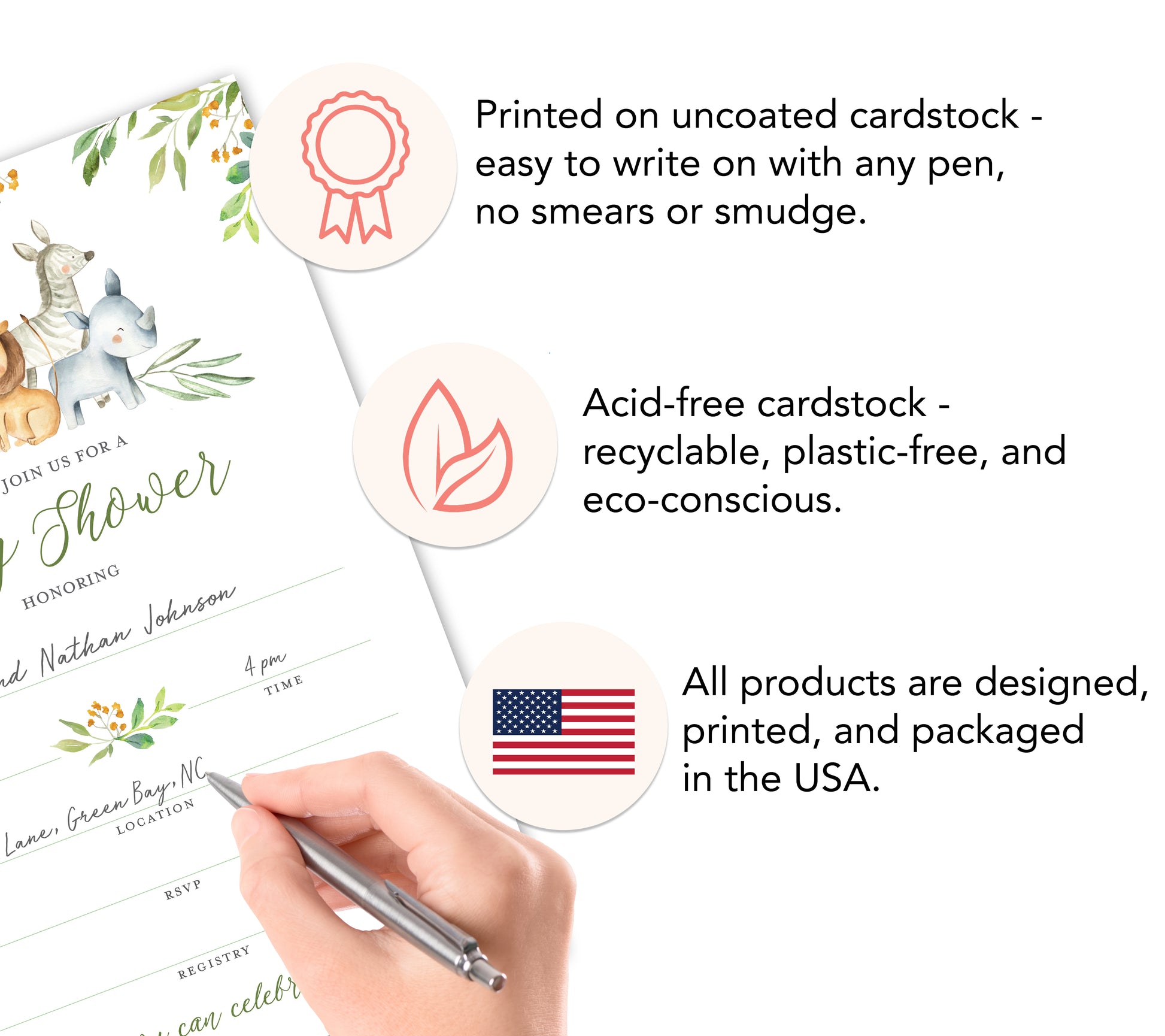 - DESIGN: Elegant and adorable safari animals — elephant, lion, giraffe, zebra, and rhino — with text in a forest green font.