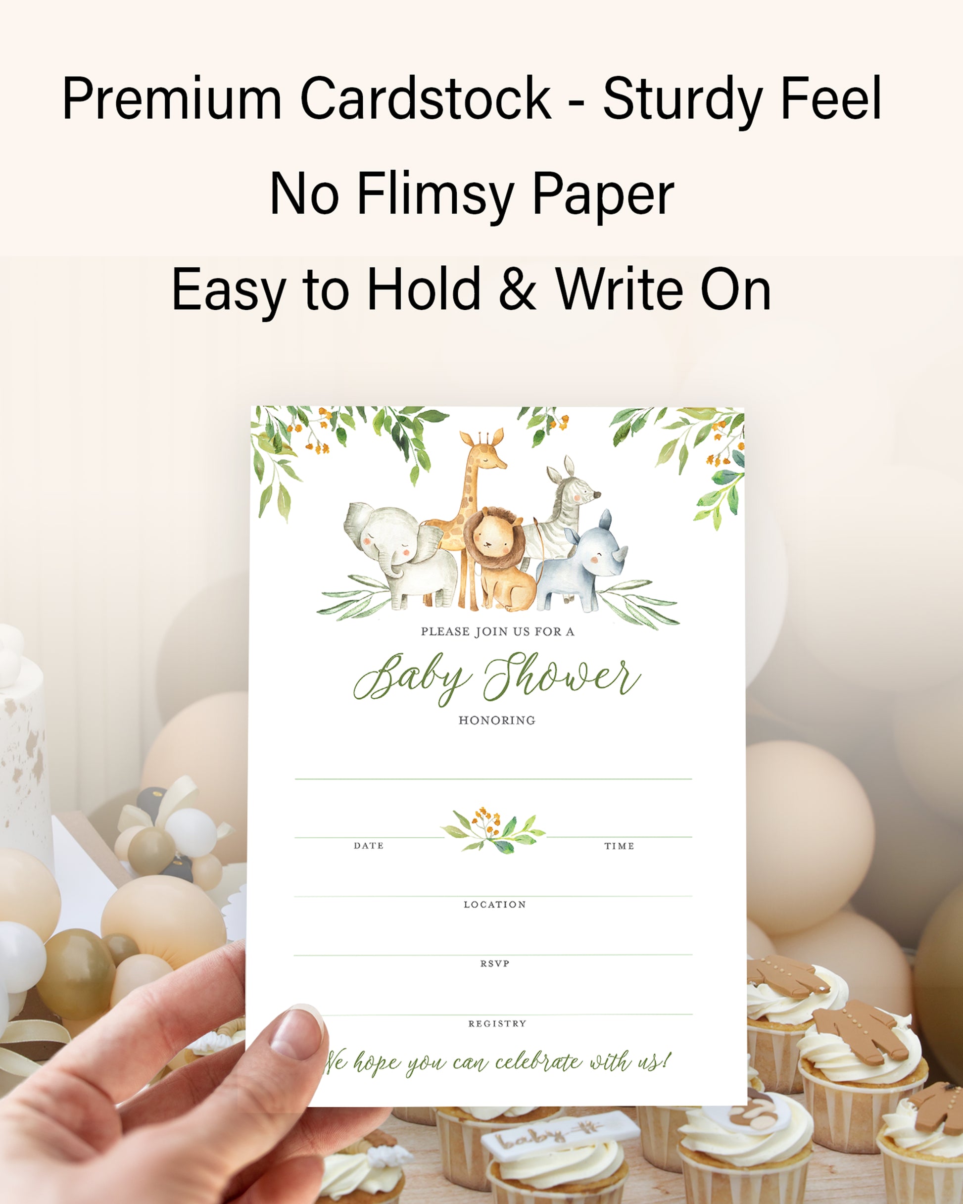 - SET OF 25 BLANK FILL-IN INVITES: Perfect for a Gender Neutral, Boy or Girl, safari or jungle-themed event. Adventure Awaits Baby Shower or Welcome to the Jungle Baby Shower or Gender Reveal!