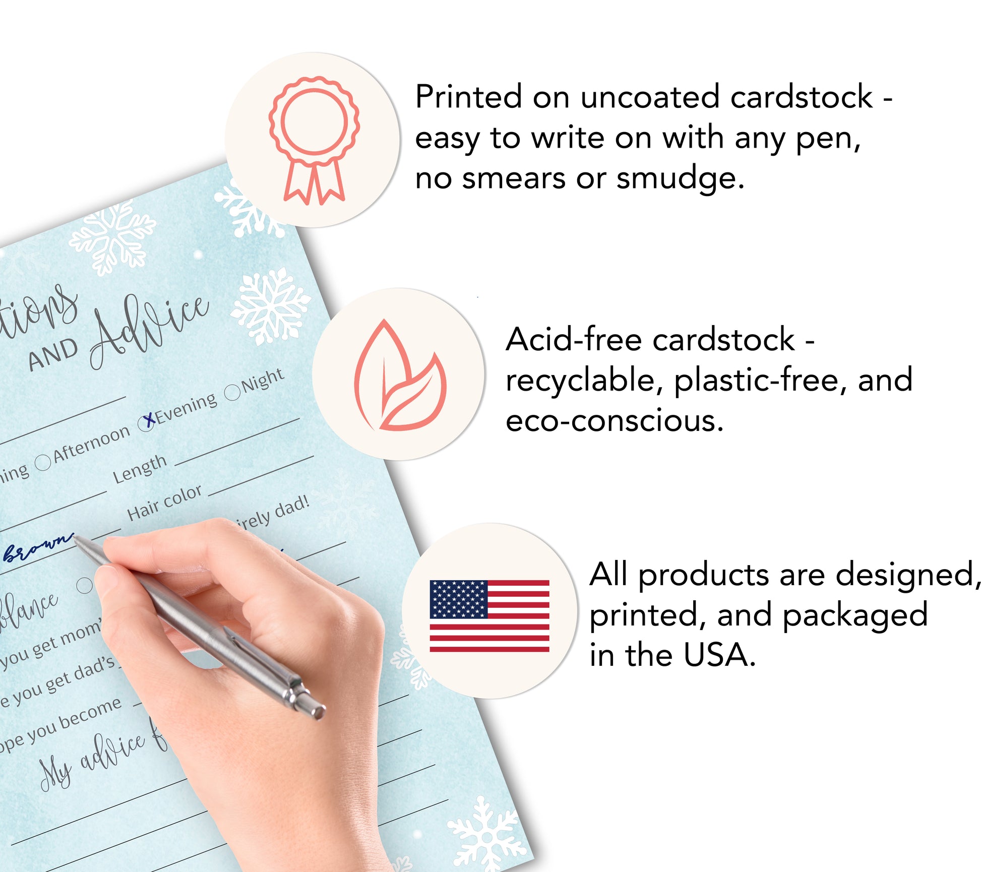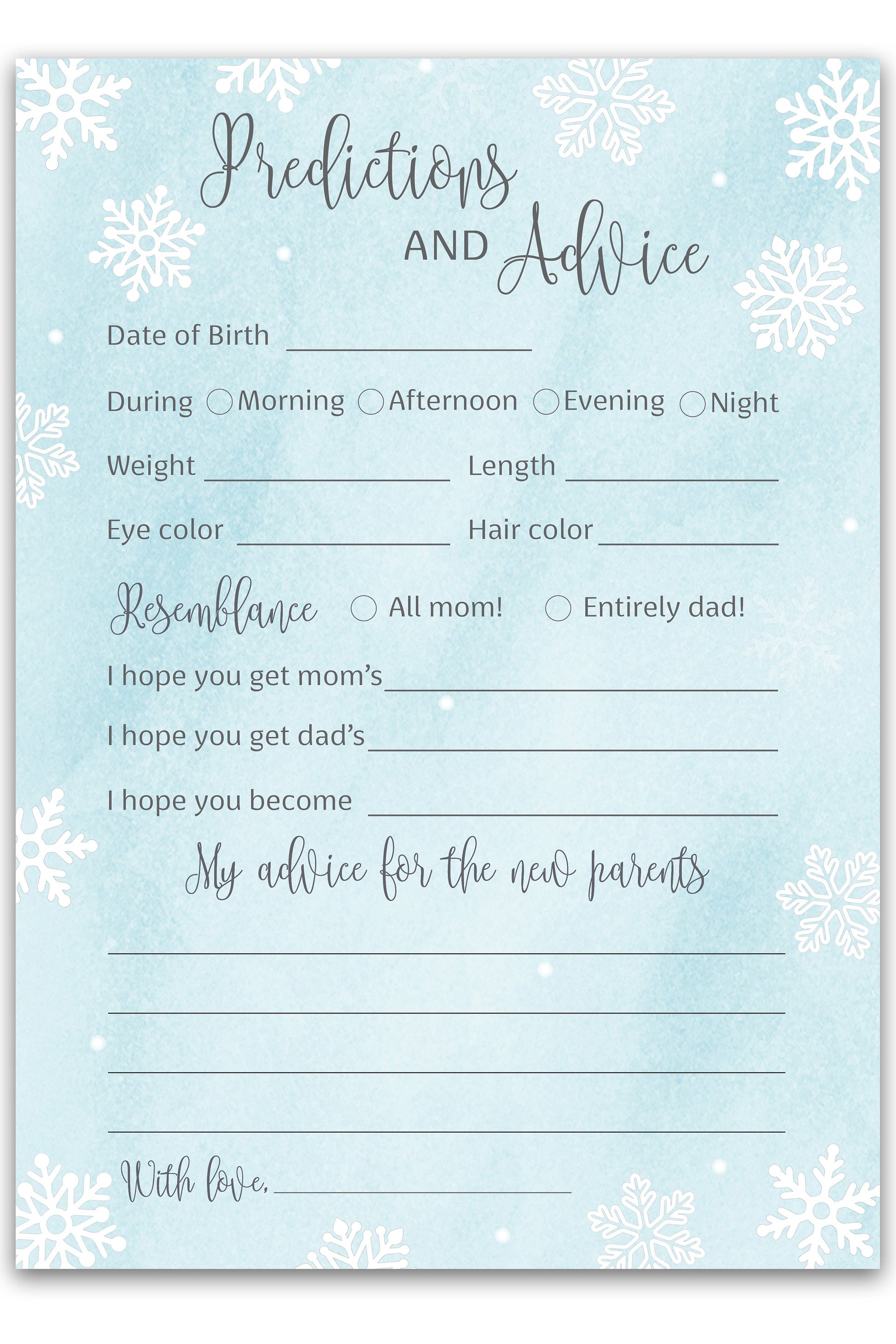 - SET OF 25 BABY PREDICTIONS AND ADVICE CARDS: A fun activity where guests share their stats, predictions, and advice — creating a special keepsake the new parents will treasure! Perfect for Baby Showers, Gender Reveal parties, and Baby Sprinkle.