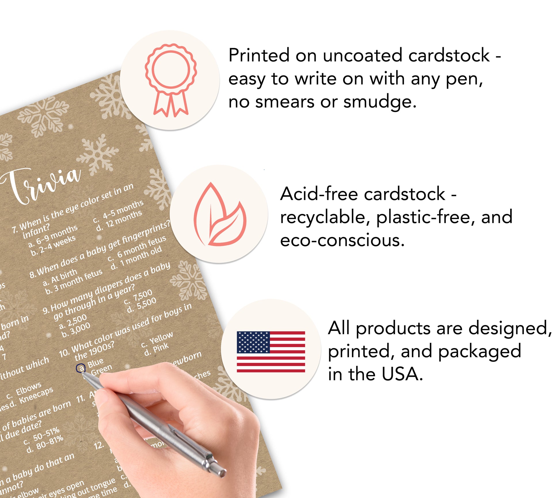 - PREMIUM THICK SMOOTH CARDSTOCK (14-pt): These sturdy game cards are easy for guests to hold and write on comfortably.