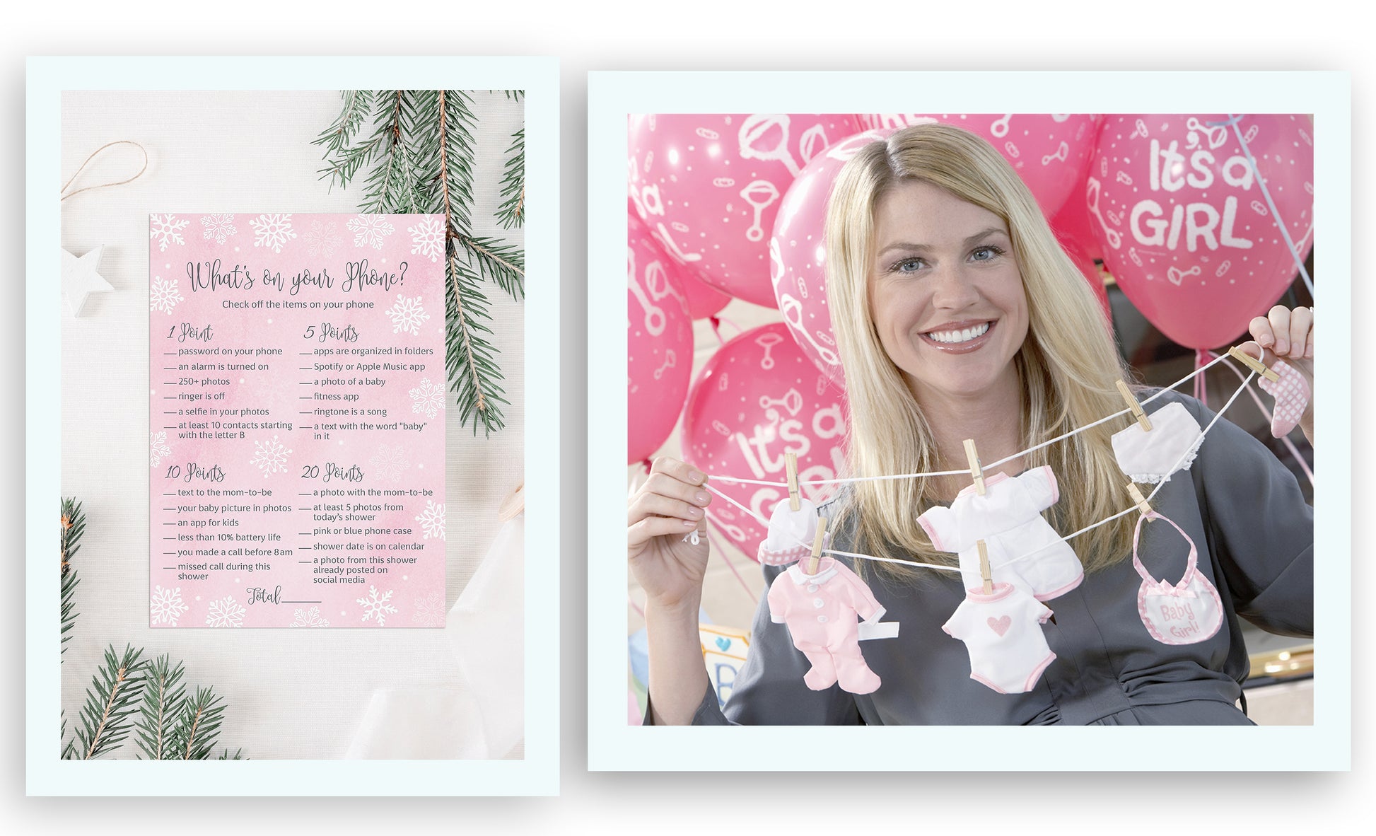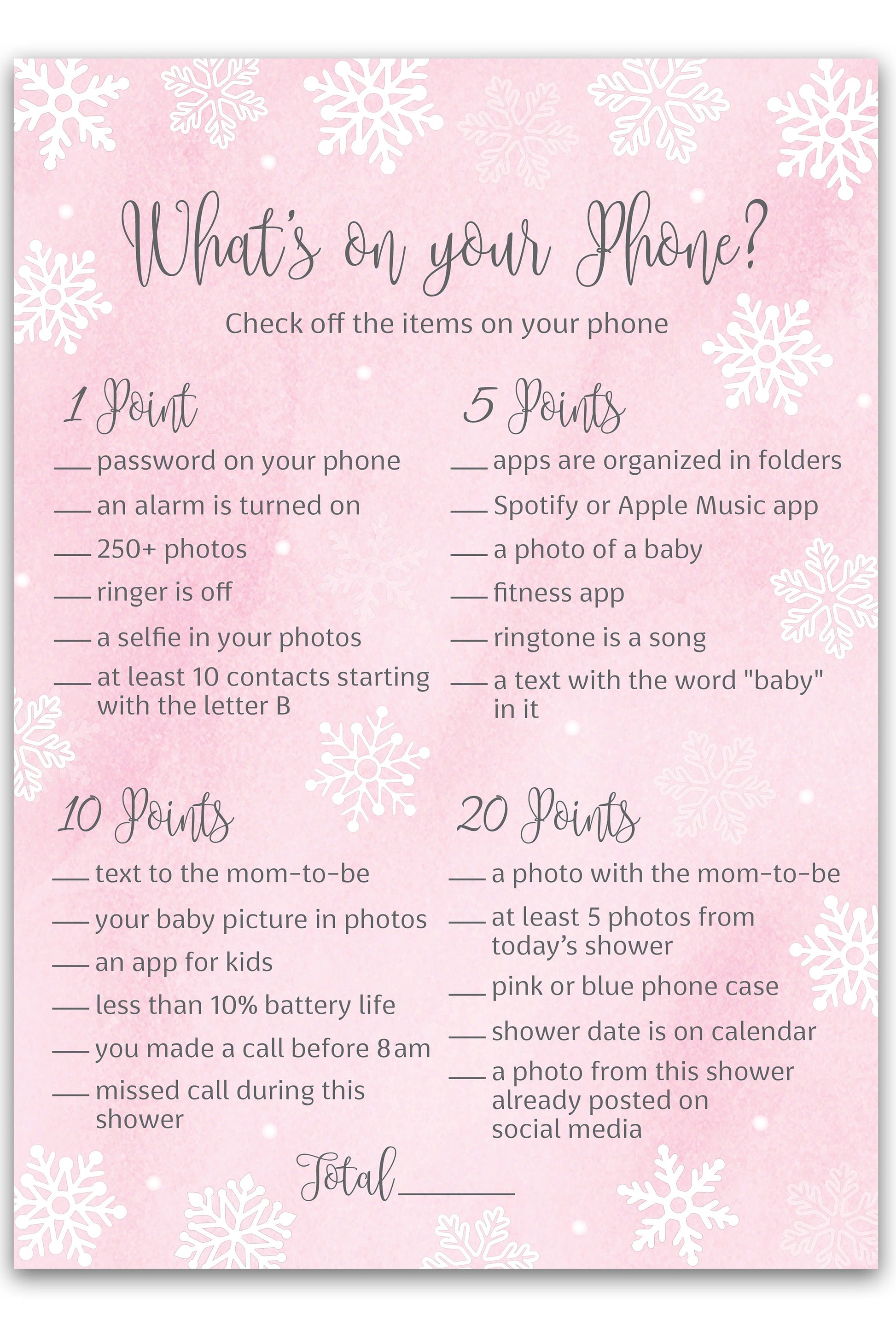 Snowflakes Baby Shower Game – What’s on Your Phone • Pack of 25 • Winter Wonderland Pink Girl Baby Shower Game