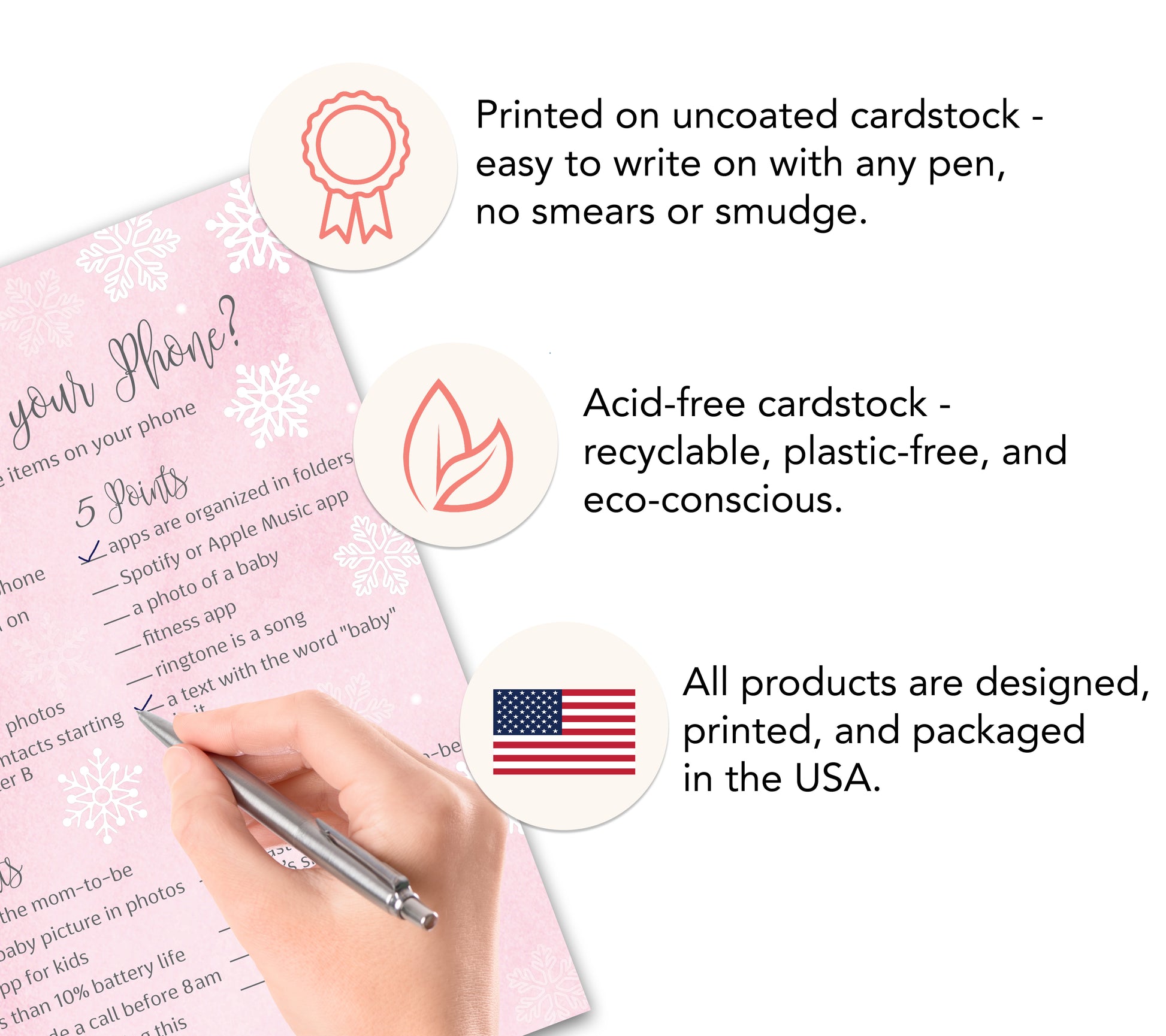 - PREMIUM THICK SMOOTH CARDSTOCK (14-pt): These sturdy game cards are easy for guests to hold and write on comfortably.