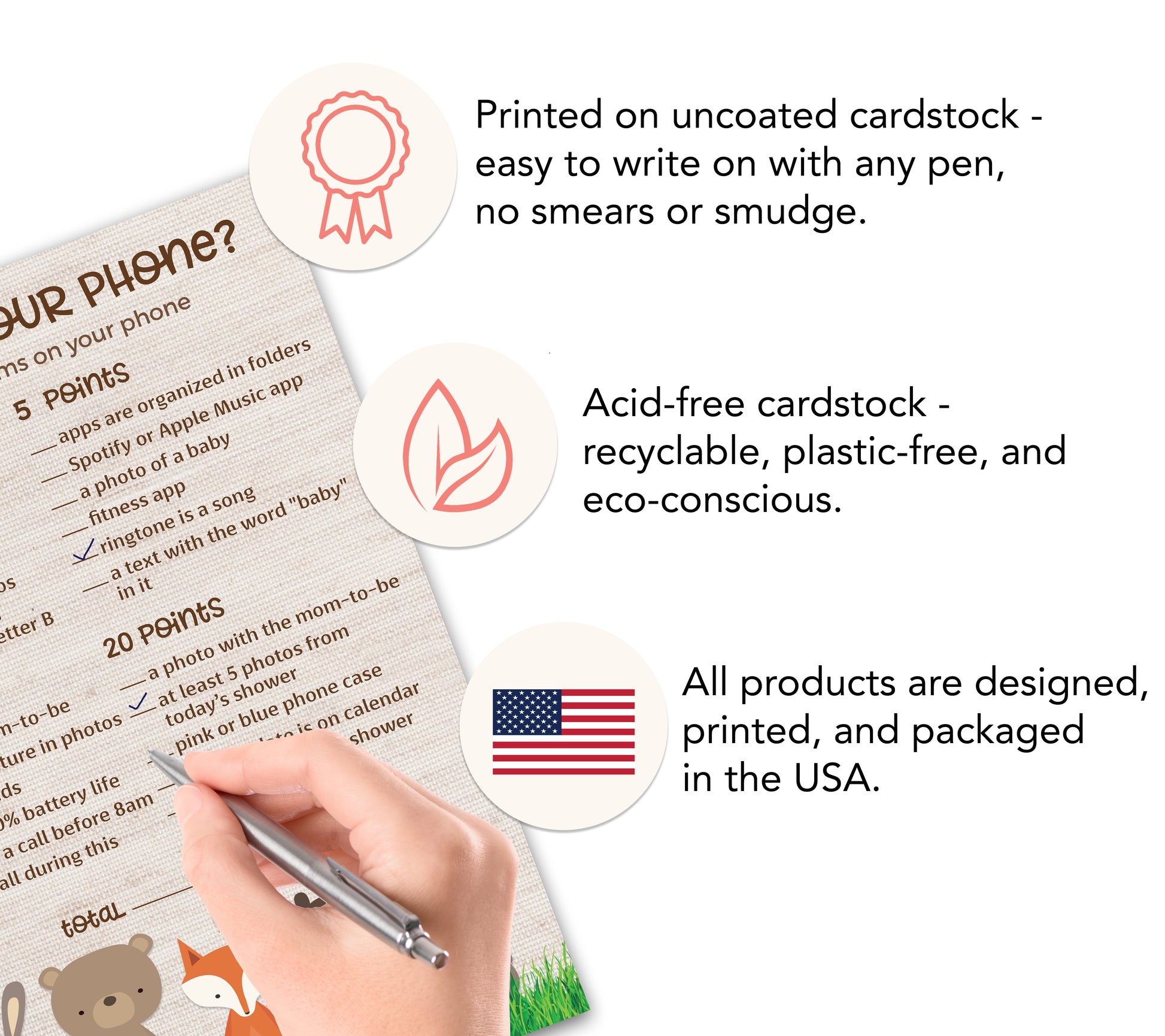 - PREMIUM THICK SMOOTH CARDSTOCK (14-pt): These sturdy game cards are easy for guests to hold and write on comfortably.